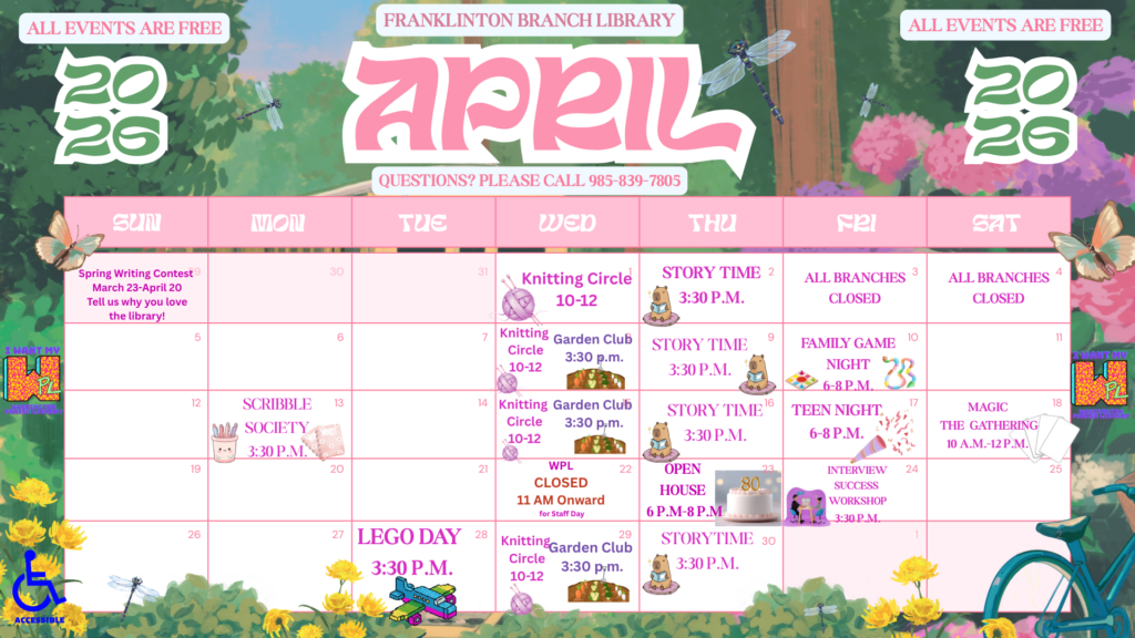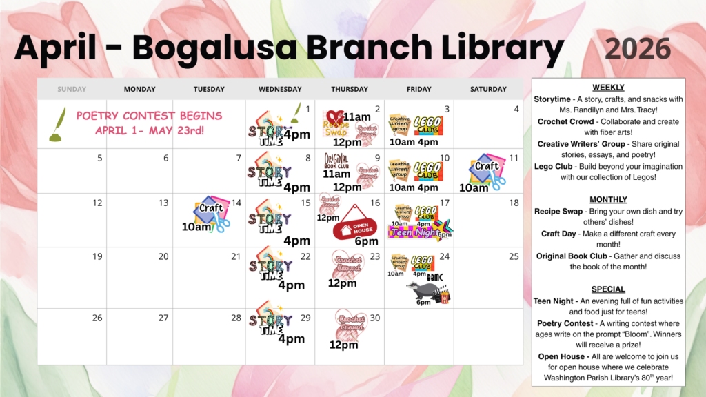 Events NOTICE! For the month of April, each branch will have an Open House. Enon: 4/2 6:00 PMThomas: 4/9 6:00 PMBogalusa: 4/16 6:00 PMFranklinton: 4/23 6:00 PM Franklinton Branch Bogalusa Branch Enon Branch Thomas Branch